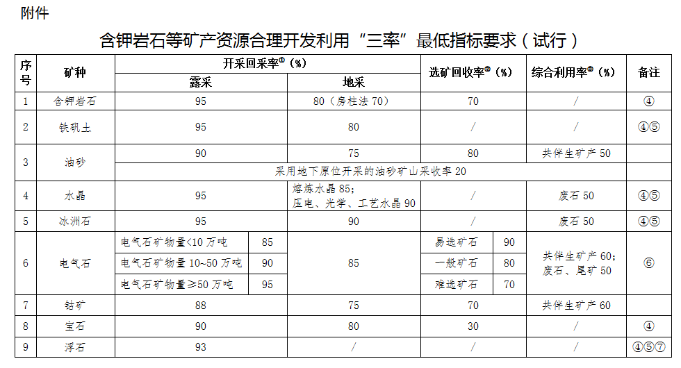 为强化含钾岩石等矿产资源合理开发利用的监督管理,促进矿山企业节约与综合利用矿产资源,依据《中华人民共和国矿产资源法》等法律法规,制定含钾岩石等矿产资源合理开发利用“三率”最低指标要求(试行),现予以公告。